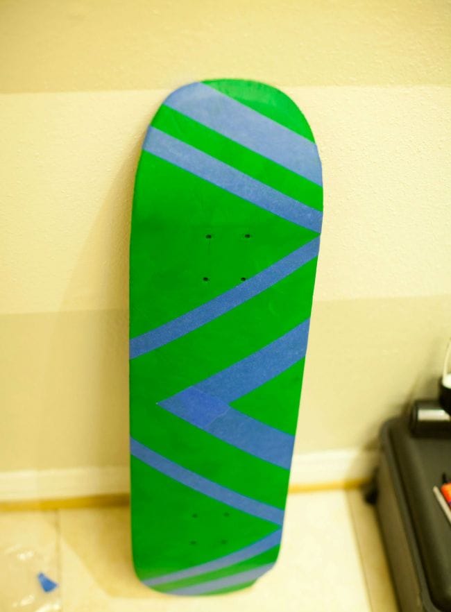 Далее произведем покраску с той стороны, где изначально находились колеса. Сначала грунтуем,затем наносим первый слой краски, даем ему высохнуть. Далее при помощи малярного скотча или же шаблона делаем оригинальный узор, пример на фото.