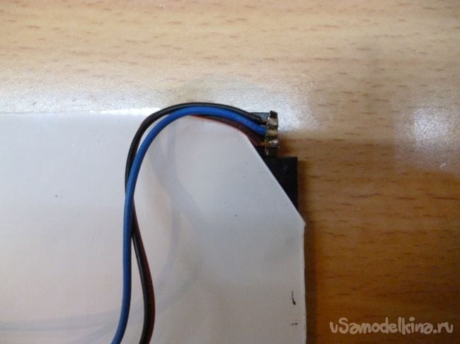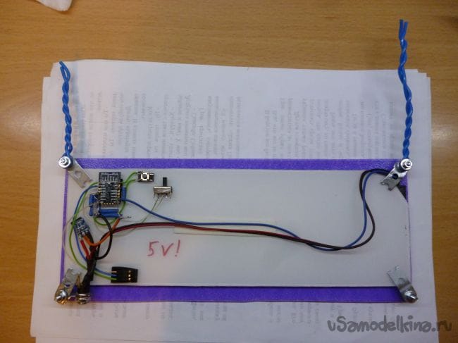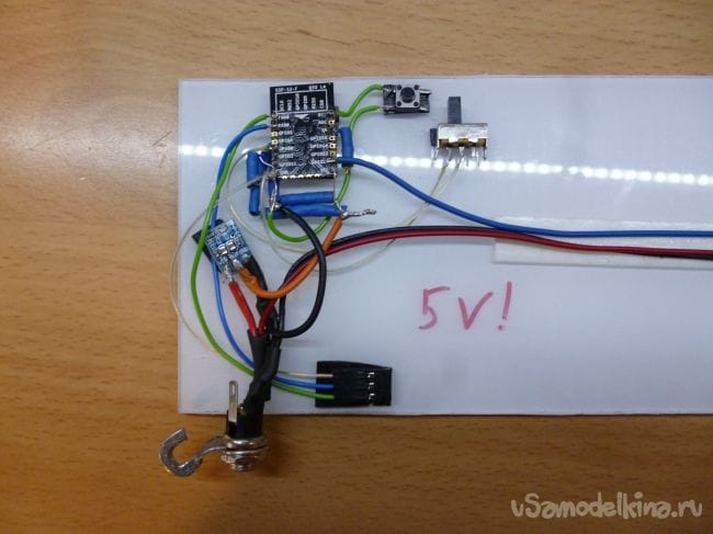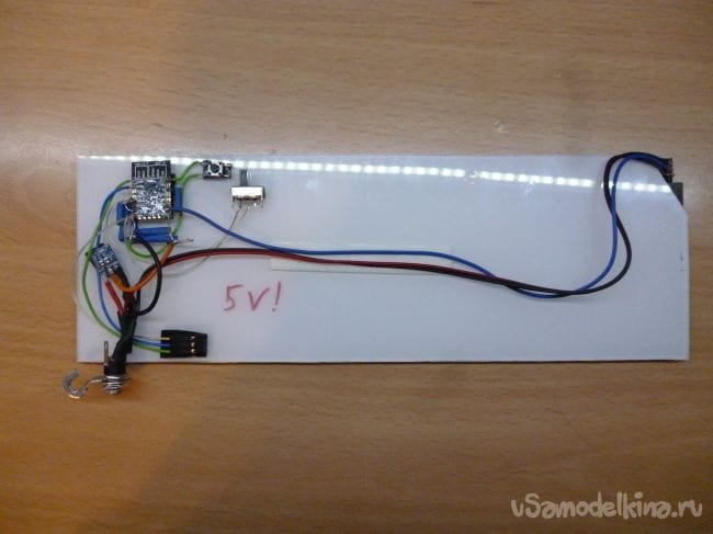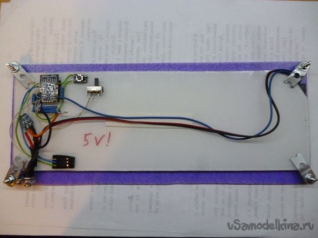 Приклеиваем все детали на двусторонний скотч с обратной стороны нашей основы. Чтобы было удобно подключать и отключать блок питания, разъем питания крепим скобой от металлического конструктора. Можно использовать любой другой материал, главное чтобы разъем держался крепко и не отваливался при подключении – отключении питания. Для прошивки выведен трех проводной PLS разъем. Получаем следующую конструкцию.