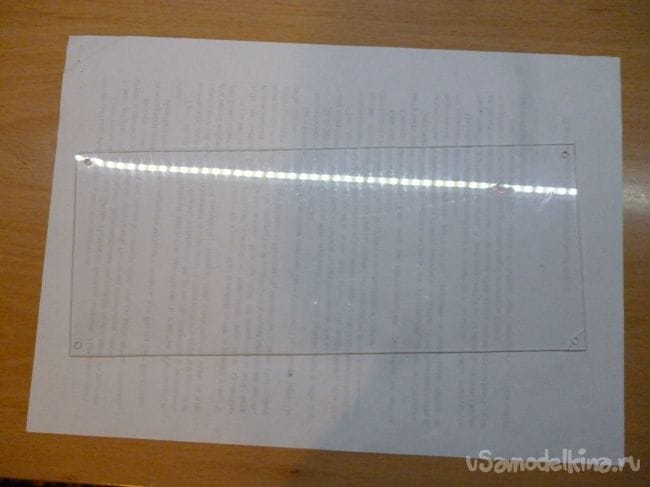 Для защиты матрицы нам нужно вырезать прямоугольник из прозрачного (лучше матового или молочного пластика, тогда не придется использовать светофильтр) пластика размером 260х105 мм. А также просверлить 4 отверстия диаметром 3.2 мм для крепления. Сверлить надо по углам, с отступом по 5 мм от каждой стороны. Делайте это очень аккуратно и положив пластик на деревянную основу. У меня в процессе работы один угол откололся, но я его приклеил и почти незаметно.