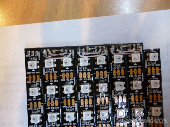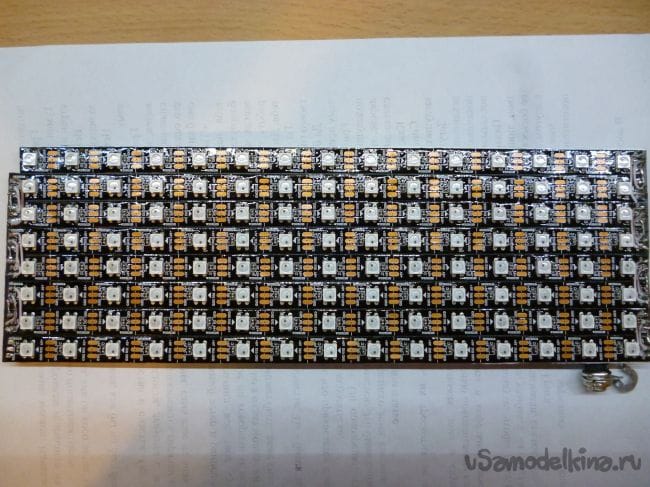 В качестве основы для матрицы я использовал тот - же пластик. Вырезаем прямоугольник 252х85 мм. Можно использовать любой другой пластик или взять, например, тонкую фанеру, главное чтобы получилась достаточно прочная основа. К ней мы будем приклеивать нашу светодиодную ленту. Разрезаем ленту на полосы по 15 диодов. Делать это надо аккуратно и строго по линиям разреза. Приклеиваем наши полоски горизонтально на основу, начиная сверху. Обратите внимание, входной сигнал должен подаваться в правильно направлении, для этого на ленте стрелочкой показано направление. Поэтому первую полоску клеим слева – направо. IN (вход) на ленте должен быть слева, а OUT (справа). Следующую полосу клеим наоборот, справа – налево. Третью опять слева – направо. Итак, далее. Если следовать по путь сигнала, должно получится зигзагообразно, начиная с верхнего левого угла. Главное не запутаться и не перепутать. Далее спаиваем наши полосы короткими проводами. + 5 от первой полости к +5 второй. GND к GND. От OUT первой полосы к IN второй полосы, от OUT второй полосы к IN третьей, и так далее. К IN первой полосы припаиваем провод, которой потом припаяем к ESP. К +5 первой полосы красный, К GND - черный. Получается следующее.