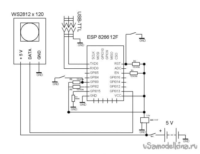 Итак, для запуска и прошивки ESP-8266 надо сделать минимальную обвязку. Напрямую к питанию подключается только вывод VCC, остальные выводы: CH_PD, RESET, GPIO0, GPIO2, должны быть подтянуты к питанию (VCC) через резистор. Резисторы на 10kOm можно заменить на другие, от 4,7kOm до 50kOm, кроме GPIO15 — его номинал должен быть до 10k. Напрямую, к минусу (GND) питания подключаем только GND, а GPIO0 подтягиваем тоже через резистор до 10kOm, для перевода модуля в режим загрузки прошивки, к GND. Нашу матрицу подключаем к GPIO13. Провод нужно припаять к IN первой полосы. Вот схема.
