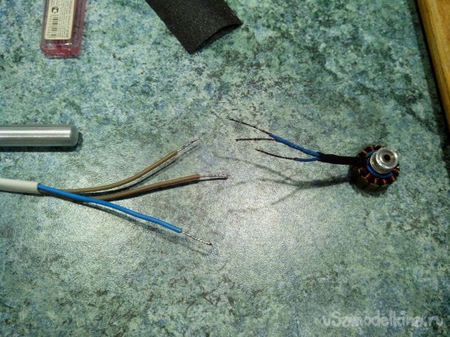 Так как один провод мотается на 4 зуба с двумя выводами, а зубов всего 12, - нам нужно три двойных провода длиной около 2,5 метров. Лучше пусть будет с запасом, чем не хватит пары витков на последний зуб.