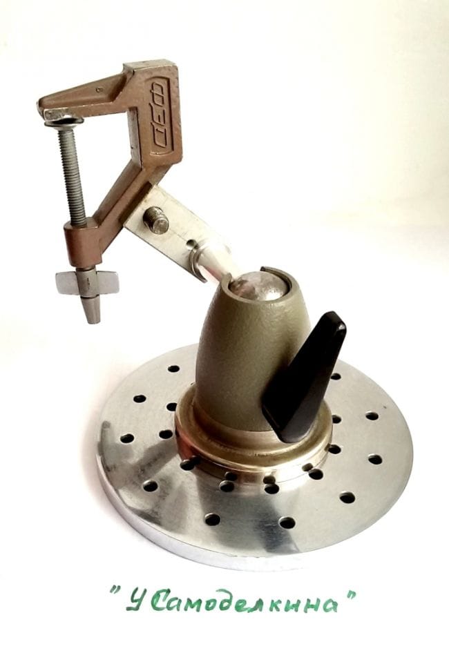 • За счет поперечной канавки треугольного профиля, выполненной в опоре струбцинки (фото 4,7,8,9), в держателе возможно надежно закрепить часовые тисочки при работе с мелкими предметами (крючки, мормышки), закрепить патрон электролампы для подсветки в затененном месте и т.д.