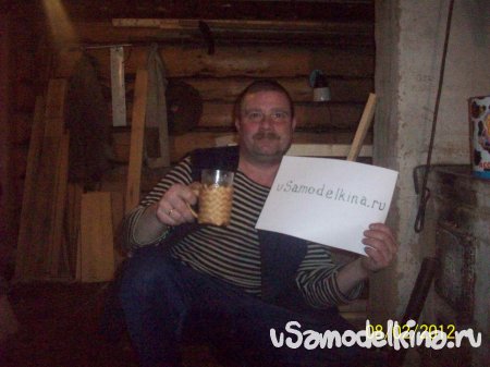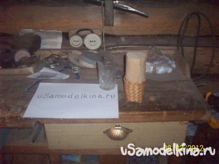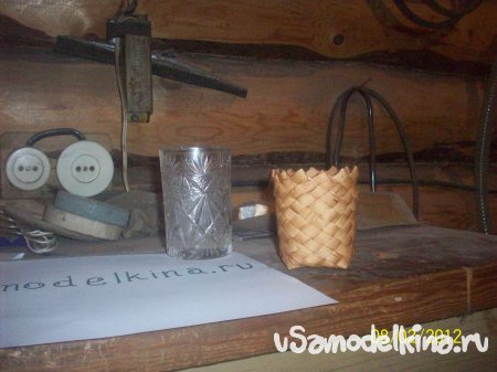 Из берестовых полосок, длинной около метра и шириной сантиметр, сплёл по болваночке подстаканничек.