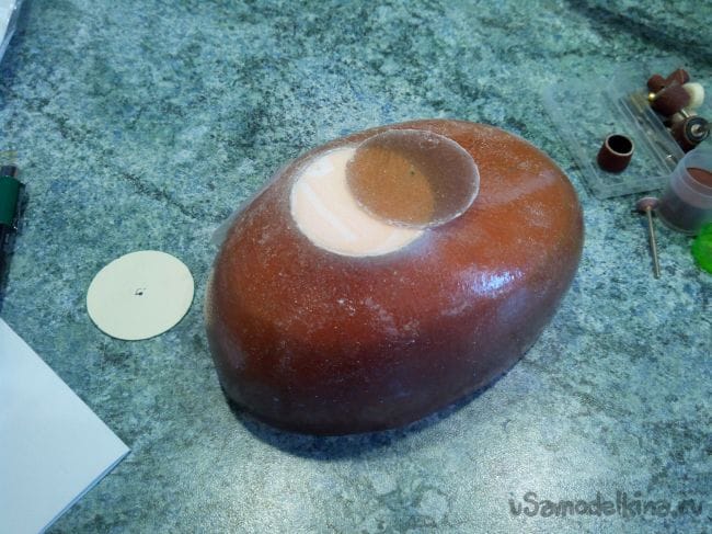 Теперь осталось извлечь болван. Для этого чертим по нижнему краю линию маркером и с помощью минидрели (при отсутствии такого инструмента можно воспользоваться ножовкой по металлу или надфилем) срезаем по ней лишнее. Работа весьма пыльная, а потому советую воспользоваться средствами защиты (респиратор и очки).