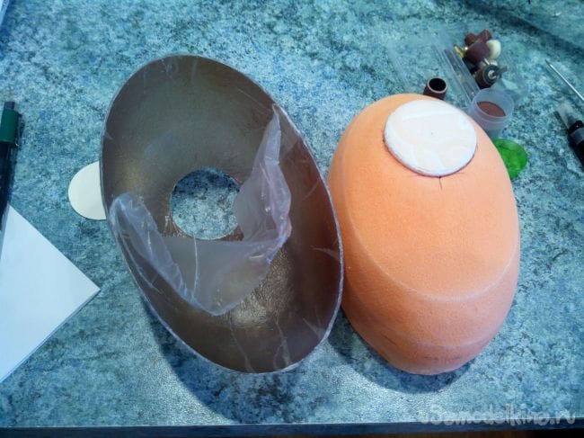 Процесс не быстрый, потому что надо при хорошем освещении следить, чтобы эпоксидка пропитывала колготки равномерно и не давала сильных подтеков в нижней части. Когда болван полностью покрыт эпоксидкой, его можно убрать на шкаф для просушки.