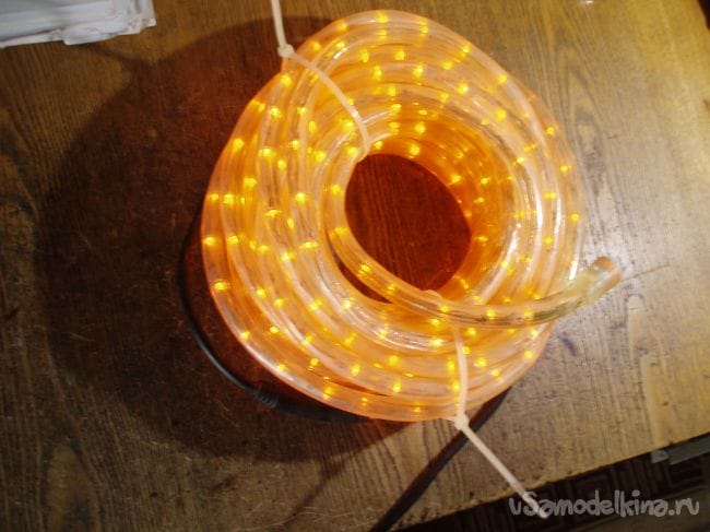 На всякий случай напомню, что дюралайт – это обычная гирлянда из маленьких лампочек, герметично запаянная в прозрачном пластиковом шнуре.