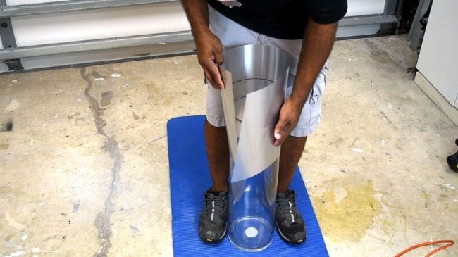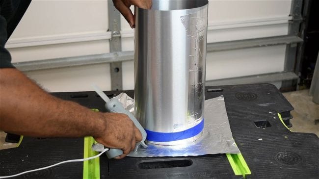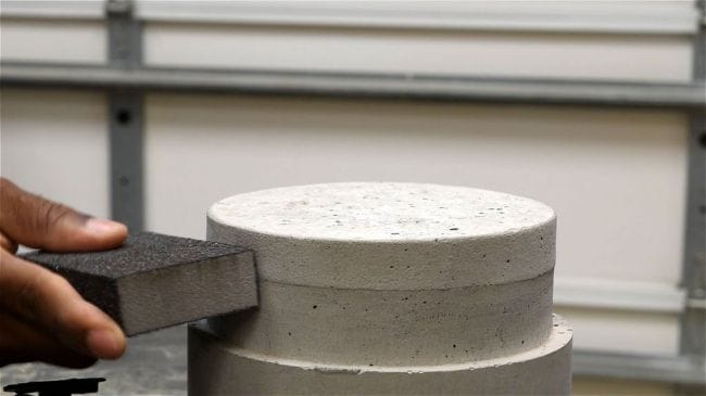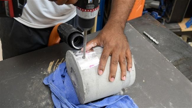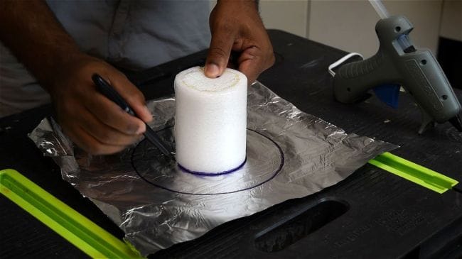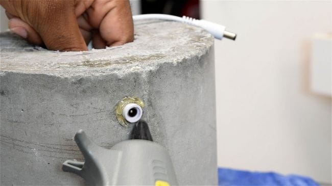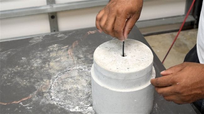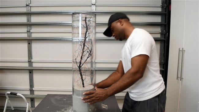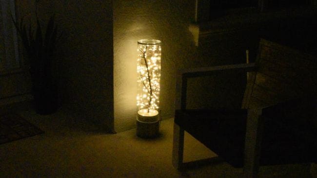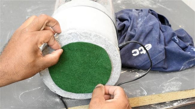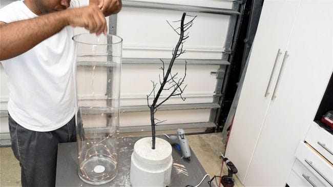 Первым делом следует создать форму для заливки в нее цементного раствора, а чтоб облегчить вес основание необходимо сделать полым. Из поролона мастер делает цилиндр.На тонком жестяном листе делает разметку, для последующего приклеивания ленты.Лист с разметкой помещается внутрь стеклянной вазы, дабы лист принял размеры цилиндра. После чего на внутреннюю разметку наклеивается лента.Вот собственно что получается.Далее необходимо изготовить дно формы, для чего автор берет лист толстой фольги или металла. наносит разметку.При помощи термоклея склеивает заготовки, внутри ровно по центру размещается цилиндр из поролона, он создаст полость в бетонном основании.Готовится раствор из песка и цемента в соотношении 1:3 и заливается в подготовленную форму.Далее следует оставить форму в покое на несколько дней дабы цемент сцепился и застыл. Потом убедившись, что все застыло, мастер приступает к разборке формы.Неровности образовавшиеся в процессе формовки, с легкостью можно убрать при помощи наждачной бумаги.Затем мастер проделывает отверстие ровно по центру основания, а чтобы не пылить использует пылесос.Так же отверстие сверлится сбоку, для того чтоб пропустить в него провод, для подключения гирлянды к электрической сети.Далее протаскивается провод.Автор установил вот такое гнездо для подключения штекера.На нижнюю часть делается крышка из фанеры.С основанием вроде разобрались ) Затем мастер переходит к созданию самого дерева, а делает он его из простой сухой ветки (лиственной породы) убирая все лишнее и подгоняя по размерам вазы. Полученное деревце нужно окрасить черной краской из баллончика.После чего ветвь устанавливается в заготовленное для нее отверстие, а в стеклянную вазу помещается гирлянда.Ваза сверху одевается на бетонное основание.Проводятся испытания, только посмотрите, какая красота!Вот такой замечательный светильник получился у автора.