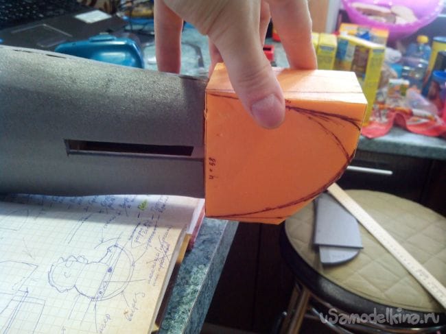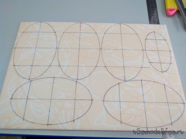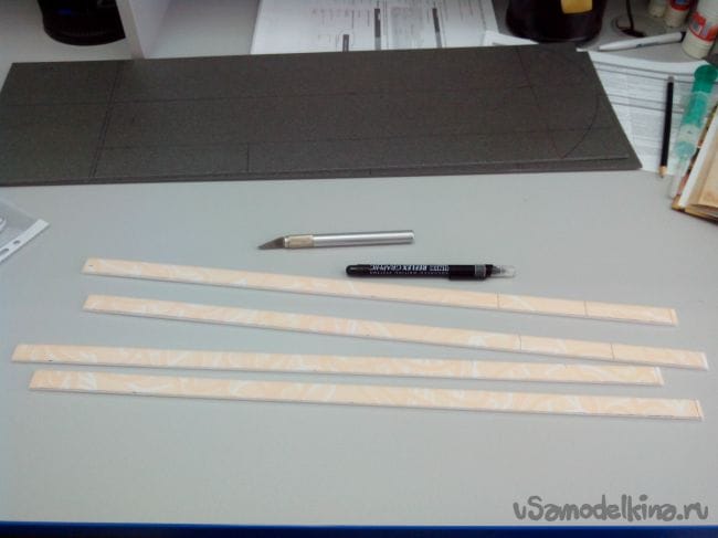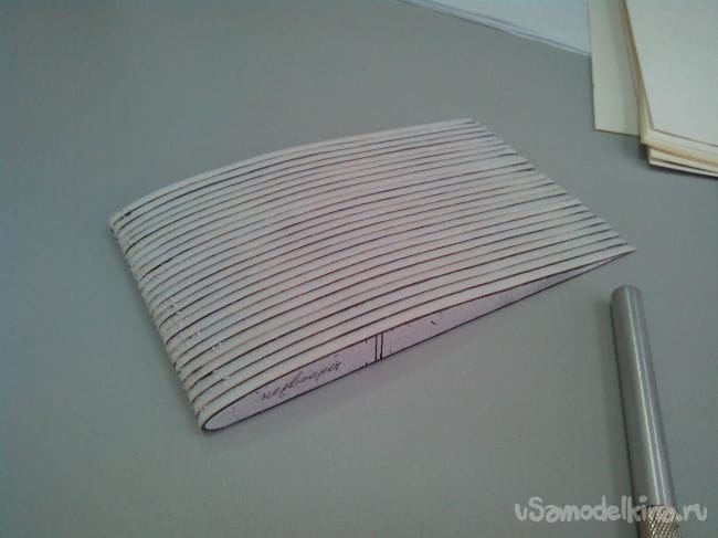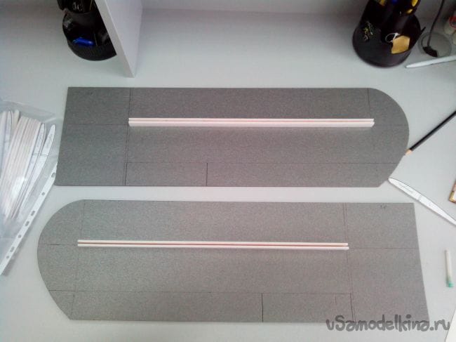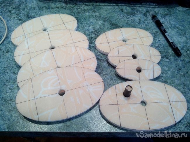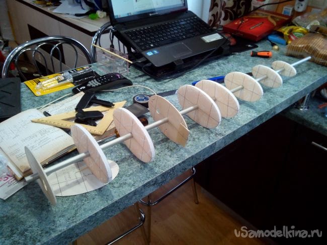Вырезаем и склеиваем их попарно, чтобы получились шпангоуты из двойного слоя потолочки и делаем по центру отверстия для трубки-стапеля.
