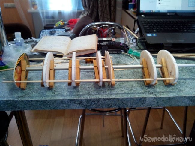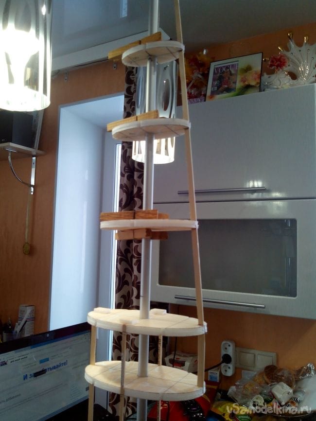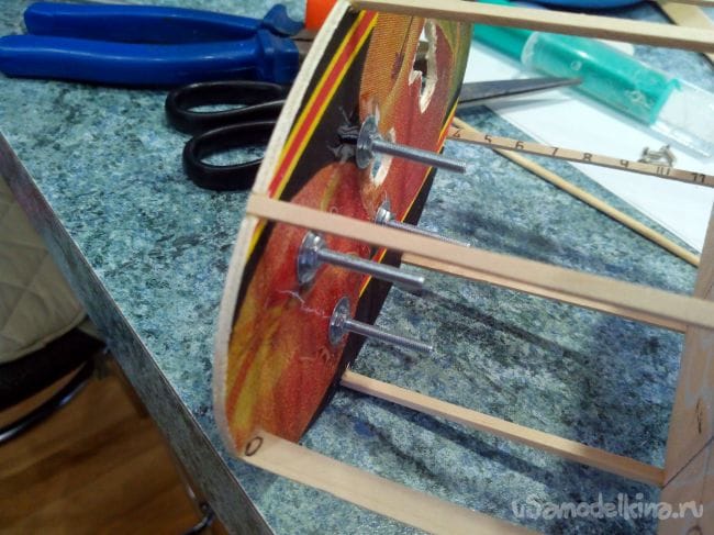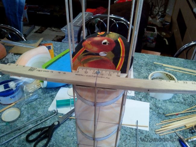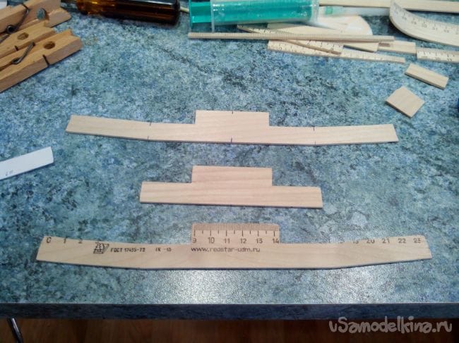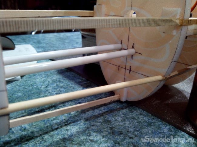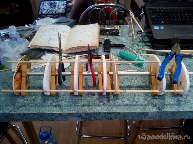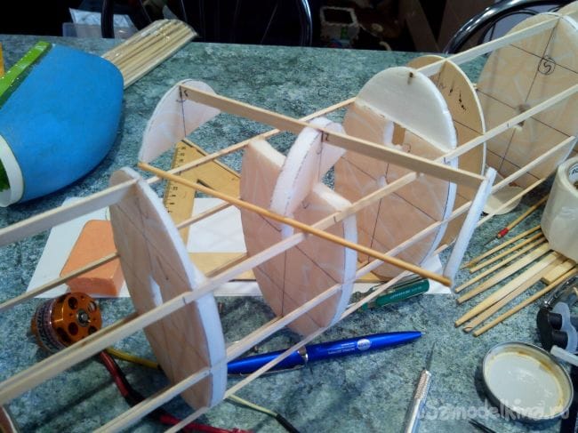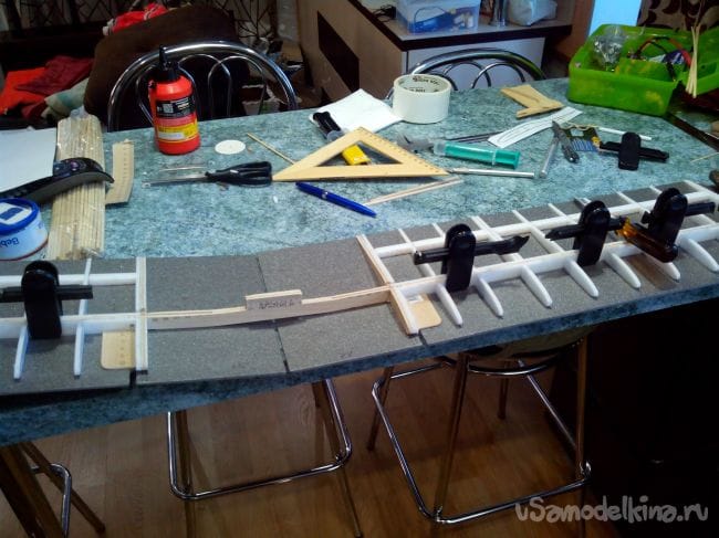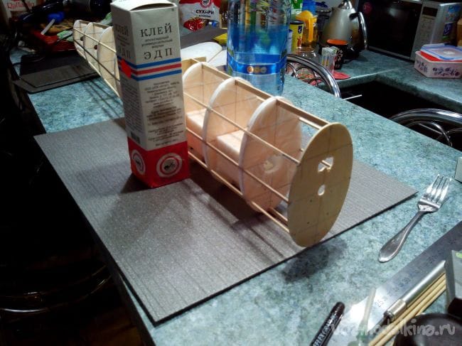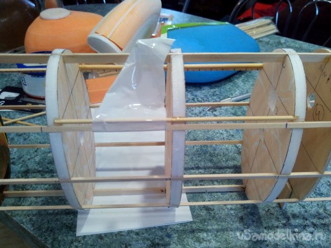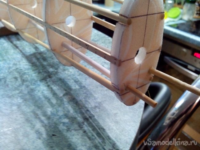 Фиксируем шпангоуты на трубке прищепками и начинаем вклеивать стрингеры из линеек и бамбуковых палочек. В фанерных шпангоутах вырезы под стрингеры делаем лобзиком, а в потолочных – надфилем.