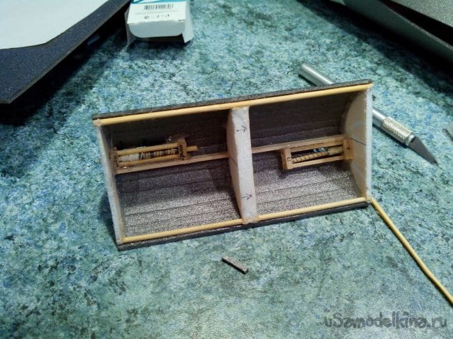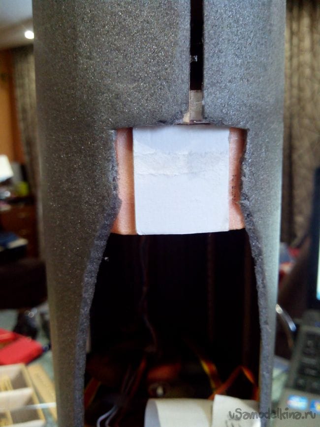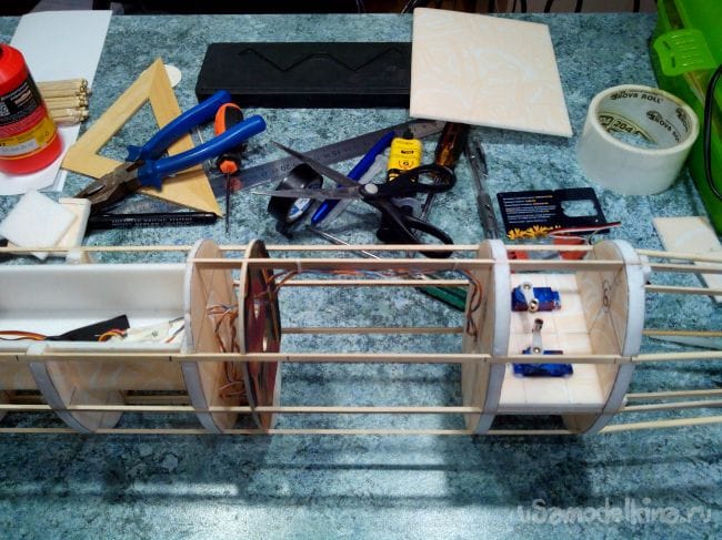 Из двойного слоя потолочки вырезаем площадку для хвостовых сервоприводов и вклеиваем между 5-м и 6-м шпангоутами. Сервоприводы можно вклеить на данном шаге – так удобней протягивать провода к моторному отсеку. Но провода лучше зафиксировать в мотоотсеке изолентой.