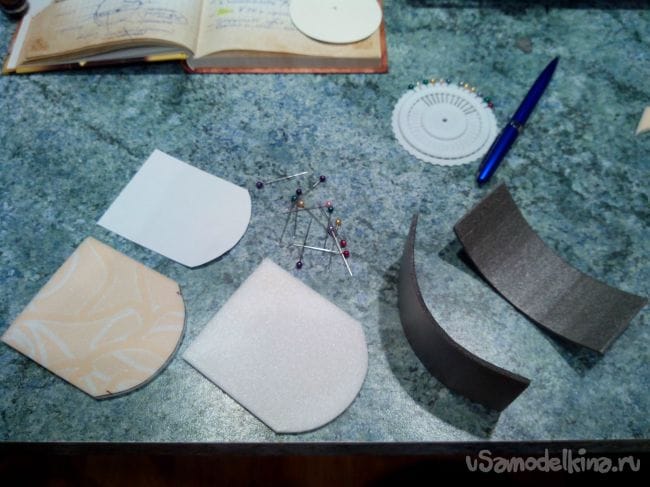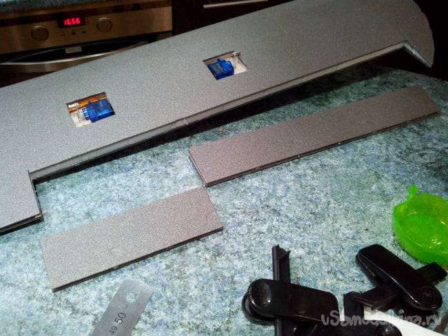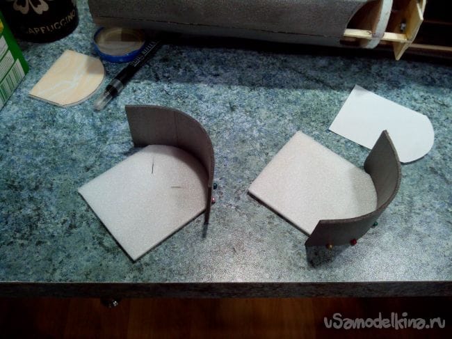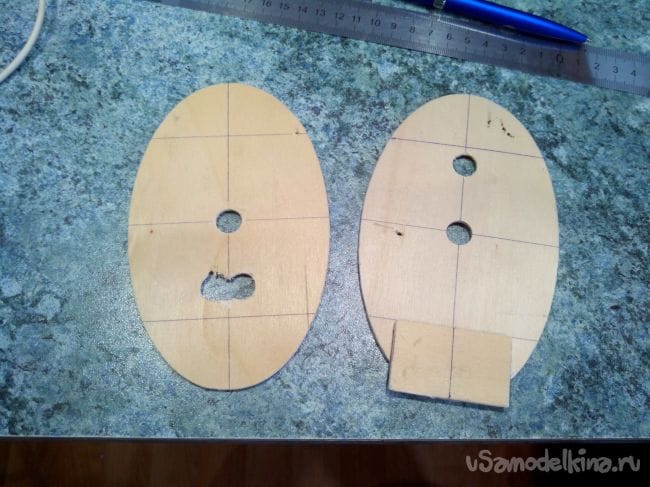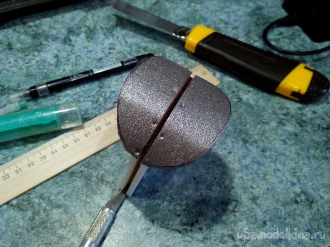 Обрезаем половинки по форме отверстия и склеиваем их, разместив между ними кусочек депрона.