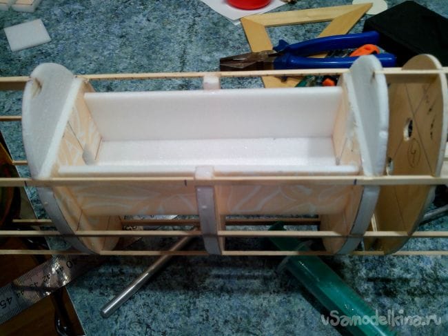 Все, каркас фюзеляжа готов, можно приступать к обшивке депроном. Проще это сделать в два этапа, обшив сначала переднюю часть (до сужения) и хвостовую (сужающуюся).