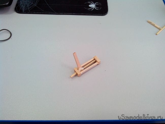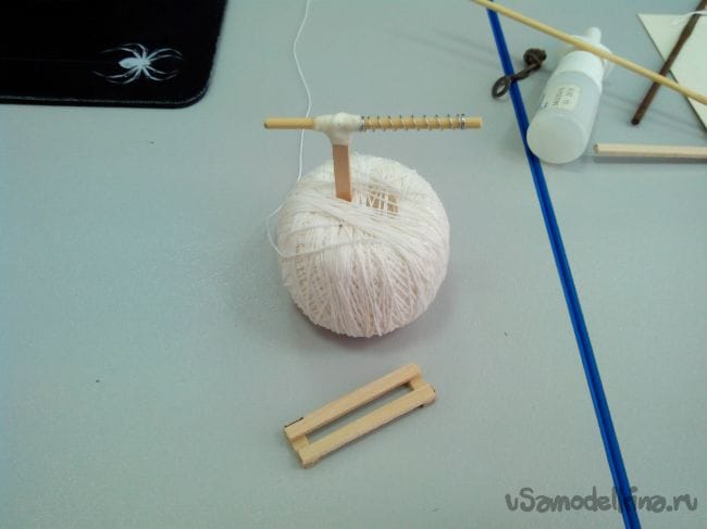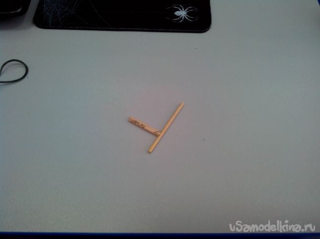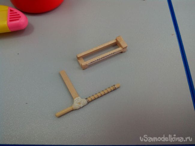 Вырезаем из линейки и бамбуковой палочки детали шпингалета и склеиваем клеем ПВА. Стык обматываем нитками на клее.