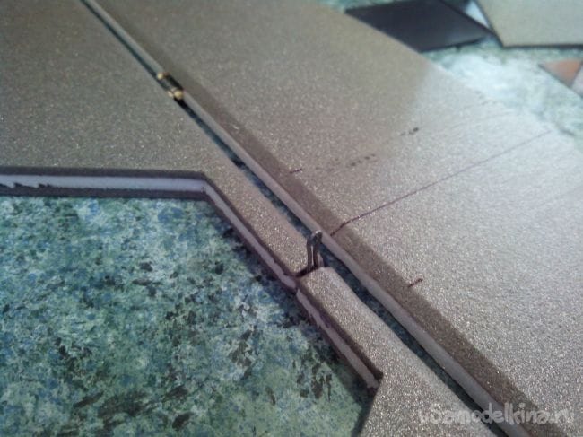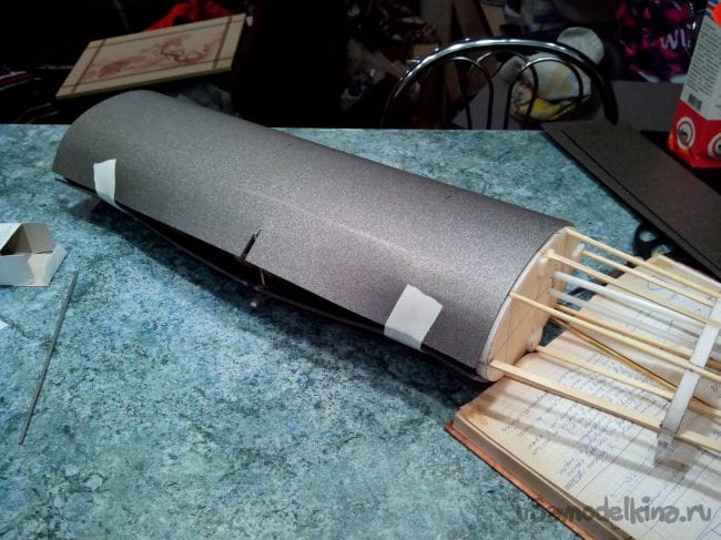 Для этого берем лист депрона и с обратной стороны вдоль всего листа продавливаем линии столовой вилкой. Затем мажем потолочным клеем верхний стрингер от 0-го до 6-го шпангоутов, включая крышку мотоотсека, приклеиваем к депрону и оставляем до полного высыхания.