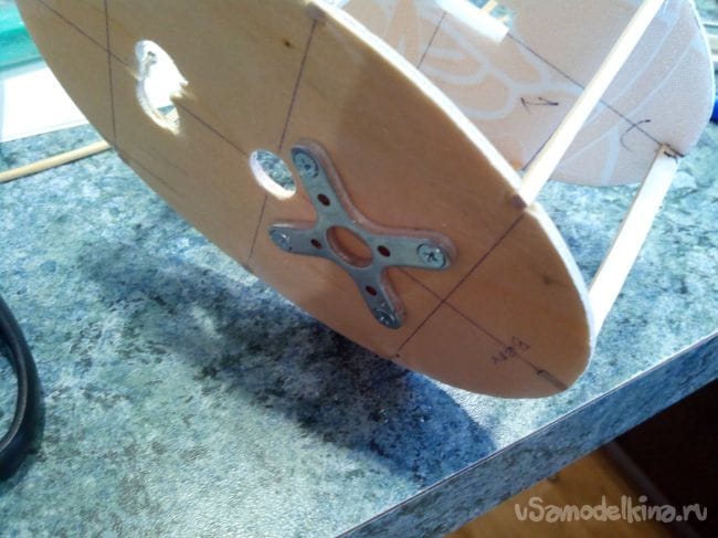 Из фанеры 3 мм выпиливаем лобзиком 0-й и 4-й шпангоуты. На нулевом будет закреплен мотор, на четвертом – крыло. К четвертому шпангоуту приклеиваем на ПВА прямоугольную площадку-утолщение. Кроме того, сверлим дополнительные отверстия для проводов.