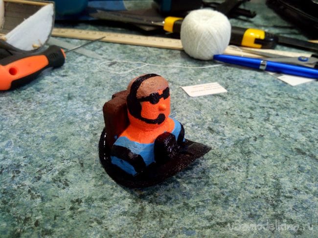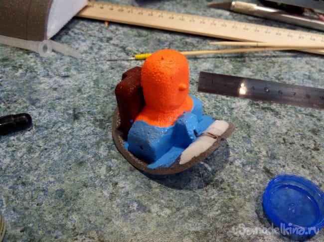 После закрепления пилота и крышки обрабатываем края наждачкой, чтобы сравнять их с обшивкой фюзеляжа. Затем красим пилота и кресло акриловыми красками. Нос пилота - из булавки.
