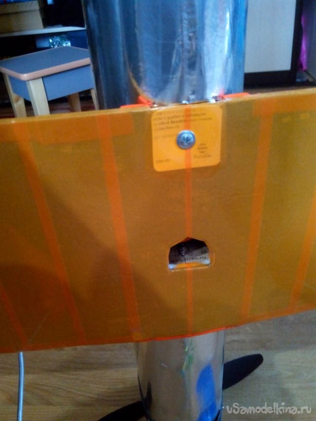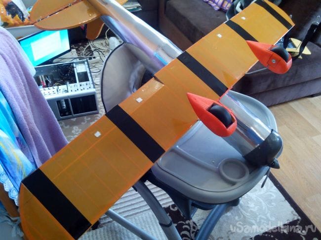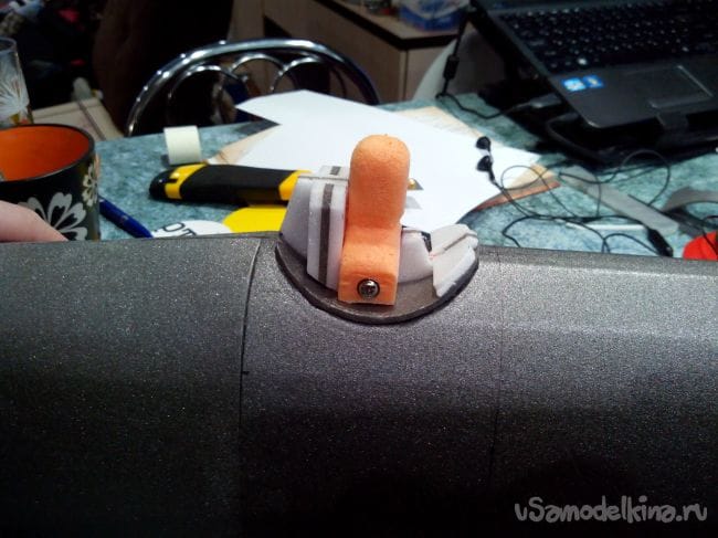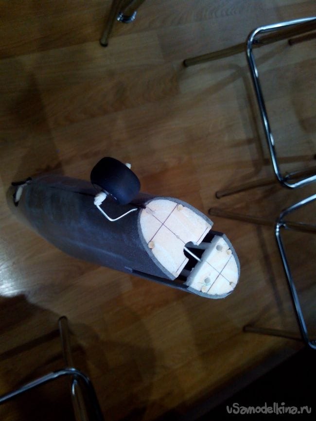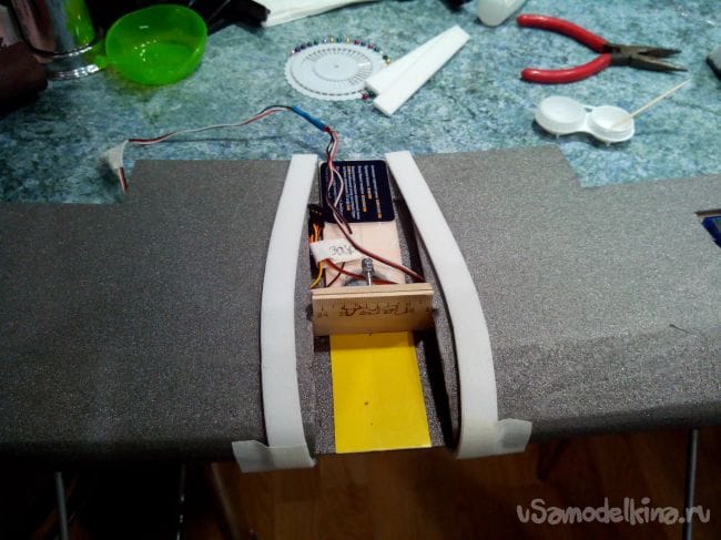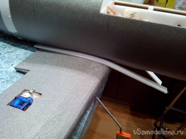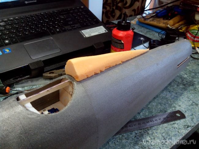 Прикручиваем крыло к фюзеляжу, предварительно сделав в фюзеляже отверстие, и приклеиваем зализы из полосок потолочной плитки.