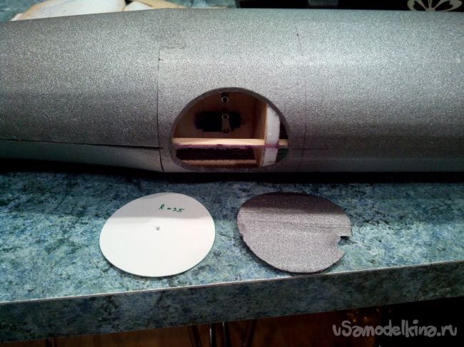Для начала вырезаем по круглому шаблону отверстие над сервоприводами (между 5 и 6 шпангоутами).