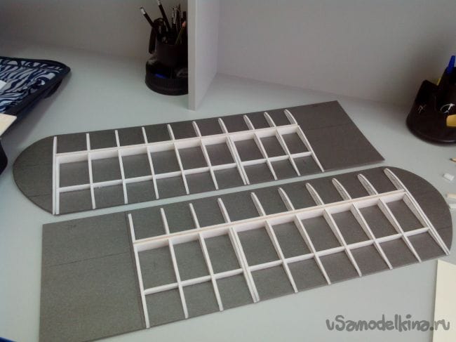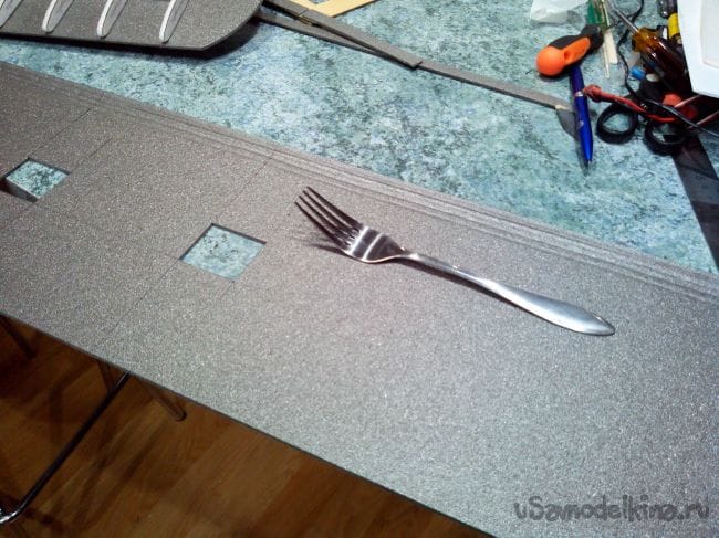 Вырезаем из депрона верхние части обшивки крыла, вырезаем в них лючки для сервоприводов и продавливаем с обратной стороны вилкой полосы в районе передней кромки.