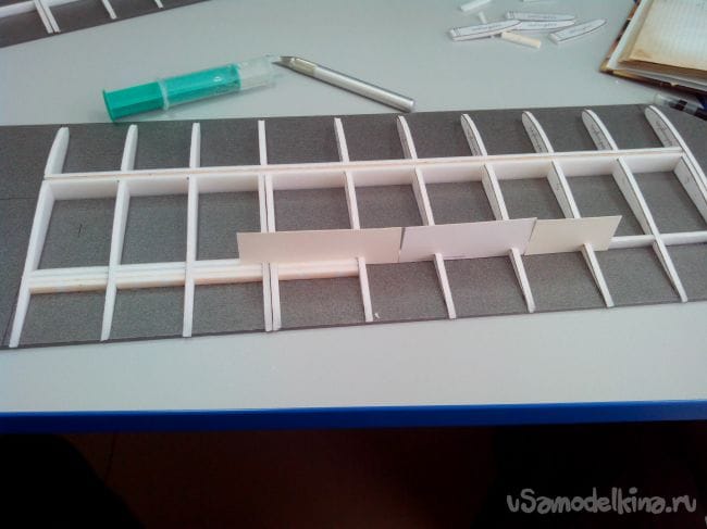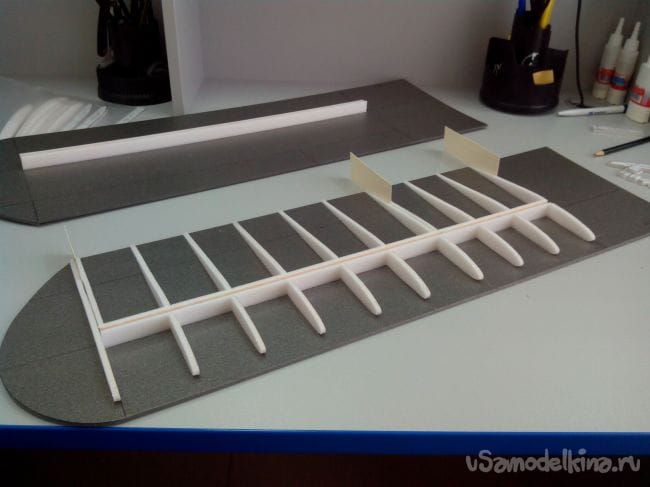 Приклеиваем лонжероны из потолочки к нижней части и делаем надрезы, которые будут разделять закрылки и элероны.