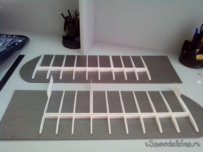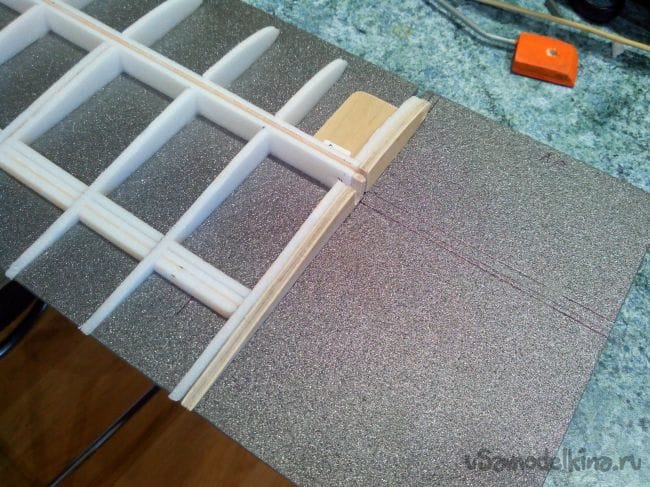 На листе депрона размечаем маркером консоли крыла, чертим линию лонжерона, закрылки, элероны и отрисовываем по шаблону законцовки.