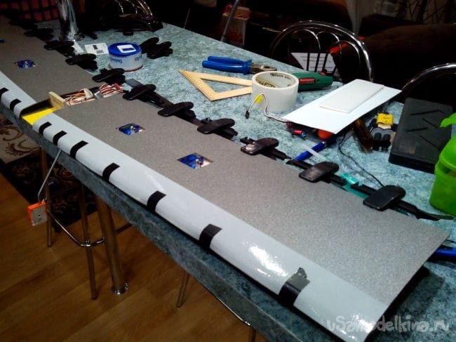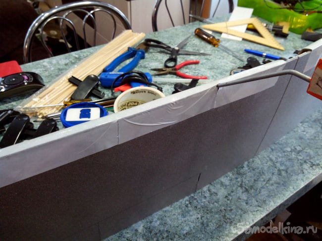 Затем намазываем все шпангоуты и стрингеры клеем и аккуратно начинаем загибать депрон. Если все делать аккуратно и не торопясь – обшивка ломаться не будет. Концы обшивки фиксируем пластырем или изолентой.
