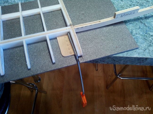 Намазываем лонжерон и заднюю часть нервюр клеем и заклеиваем верх. Фиксируем изолентой и прищепками.