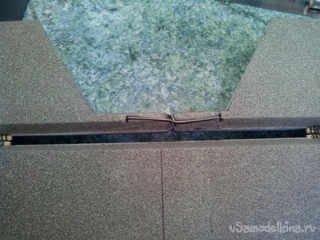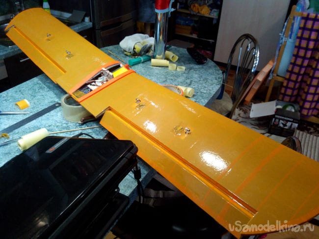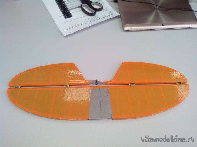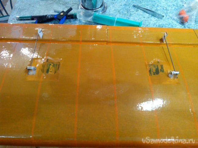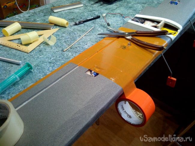 Обклеиваем крыло скотчем, сажая на него же элероны и закрылки.