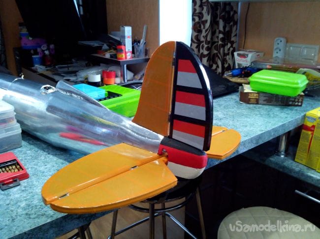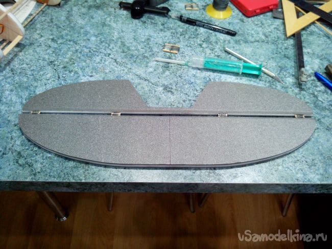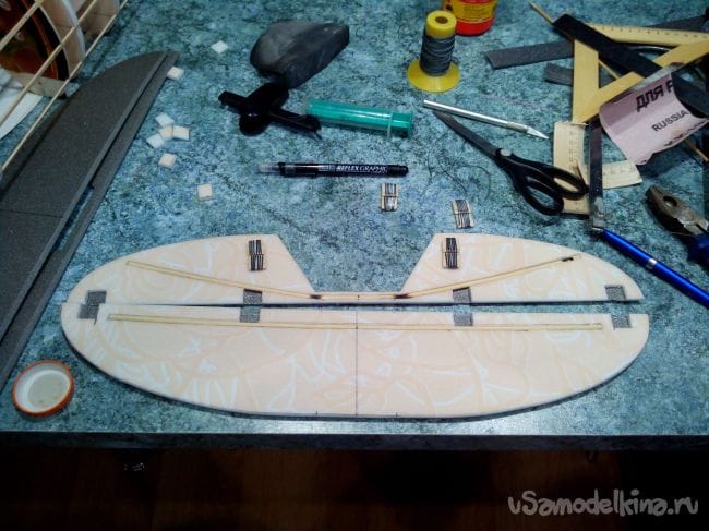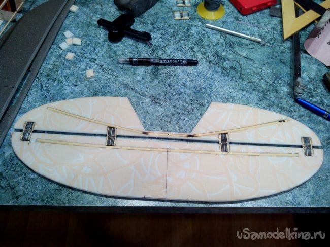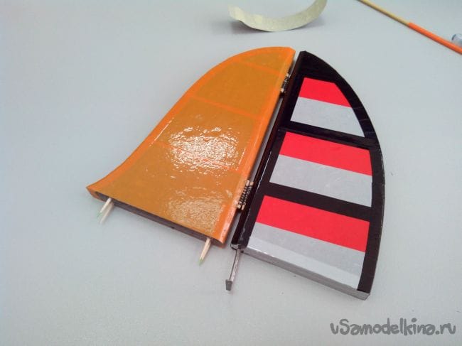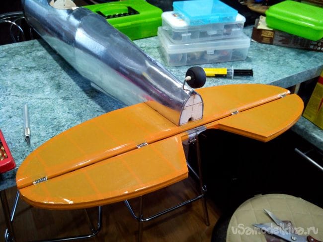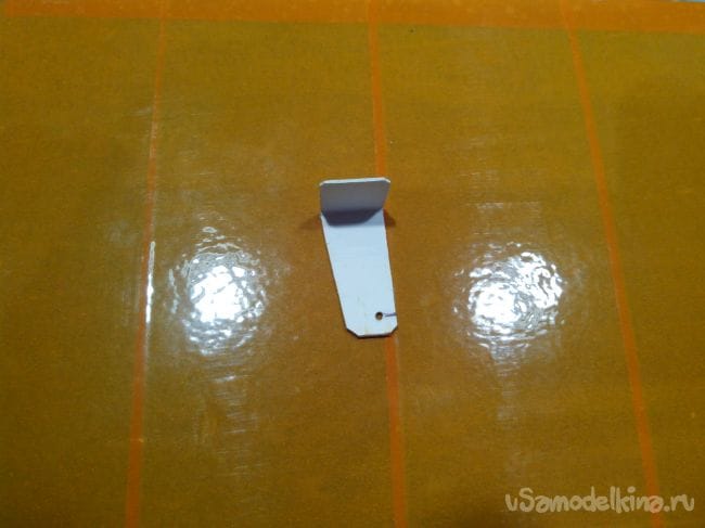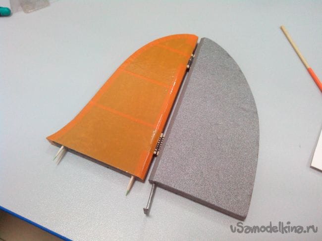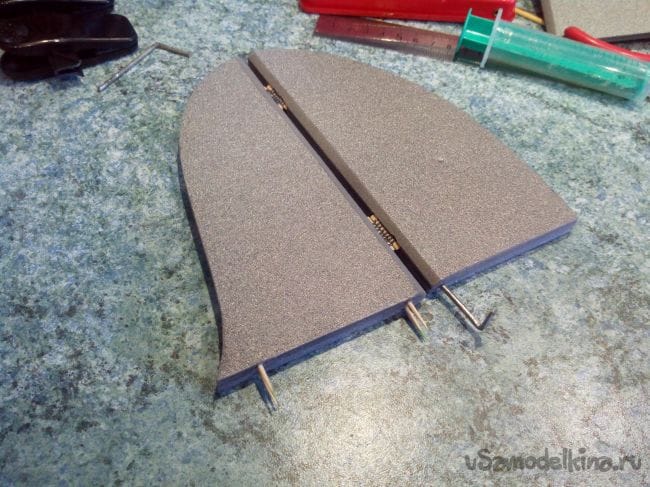 Аналогично делаем киль и руль направления, только сразу в процессе склеивания половинок добавляем между ними кабанчик из стального прута, который на одном конце расплющен и просверлен.