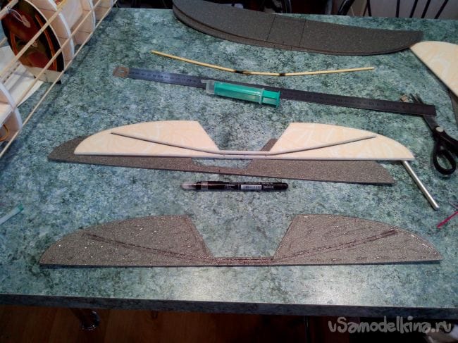 Вырезаем из депрона и потолочки по шаблонам детали стабилизатора и руля высоты.