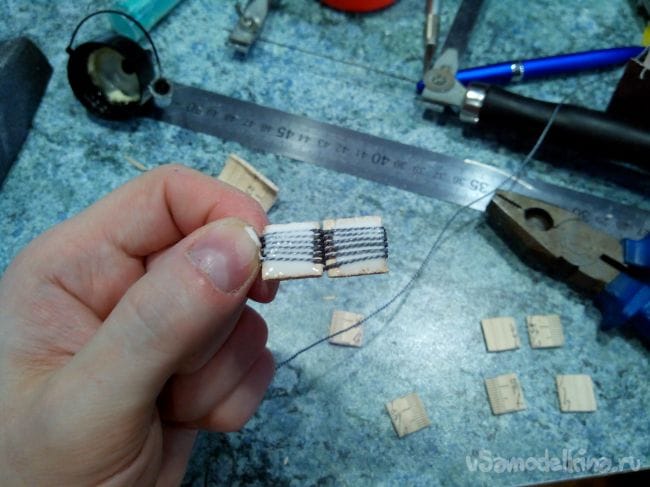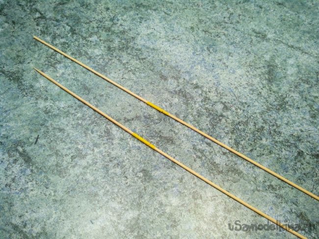 Тяги из бамбуковых палочек. Если не хватает длины, склеиваем «на ус». На концах бамбучин нитками с клеем – кусочки стальной проволоки.