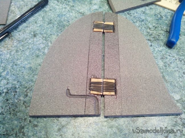 Крышку мотоотсека вырезаем резаком, делаем две прорези для ручек шпингалетов и вклеиваем шпингалеты термоклеем.