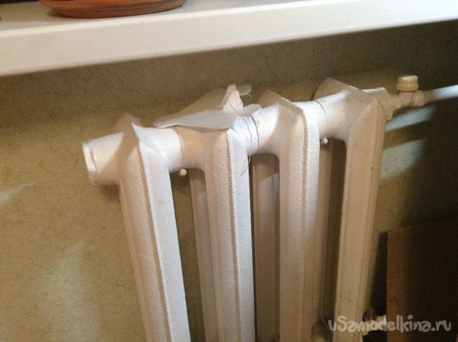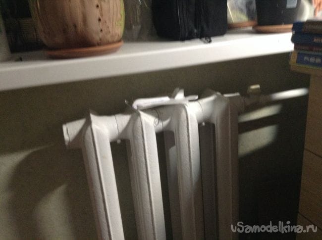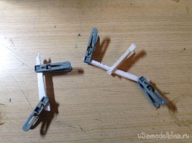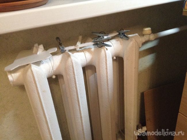 Шаг 5: детали 2 и 3 надо склеить между собой и зажать прищепками. Так же кладём их на батарею.