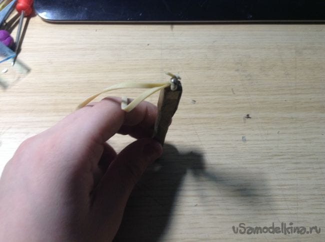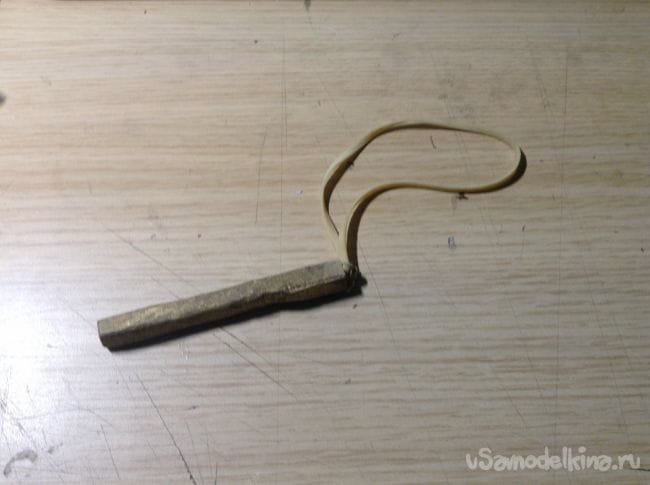 Брус с помощью наждачной бумаги закругляется. В верхней плоскости по центру делается небольшое отверстие шилом куда будет вкручивается болт. Болт вкручиваем не до конца, оставляем расстояние между бруском и шляпкой болта 3 мм. На этом месте завязываем резинку 3-4-мя узлами. К сожалению нет фото как её делал (делал года 3 назад).