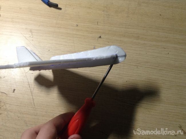 Шаг 8: когда все детали склеятся, в нижней части носа самолёта надо проделать отверстие шилом и вклеить туда спичку без серной головки. Лишняя длина спички обрезается.