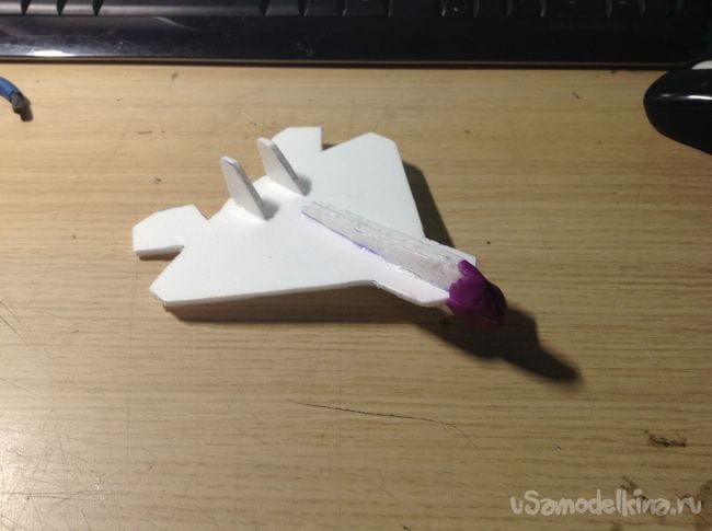 Шаг 9: прилепляем к носу самолёта небольшой кусочек пластилина. Он нужен для того, чтобы самолёт не затормаживался воздухом.