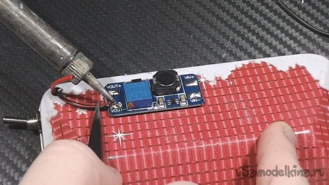 Крепим преобразователь напряжения на двусторонний скотч(обязательно настроить на 12V).