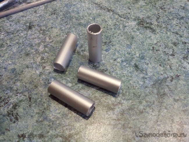Отпиливаем от дюралевой трубки четыре кусочка длиной 36 мм (данный размер опять же под аппаратуру Turnigy TGY-i6) и обрабатываем края напильником.