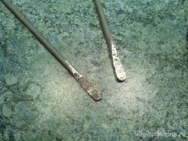 Другой конец электрода тоже расплющиваем молотком, но так, чтобы плоскость оказалась перпендикулярной другому концу. Затем зачищаем электроды наждачкой.