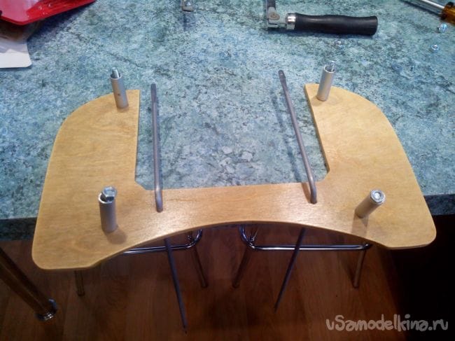 Продеваем заранее согнутые стойки в верхнюю часть столика, вставляем болты и надеваем на них куски дюралевой трубки. Если по какой-то причине Вы не смогли найти трубку, ее можно заменить дополнительными гайками, прикрутив болты сначала к верхней части столика, а затем закрепить нижнюю часть столика на болтах гайками с двух сторон.