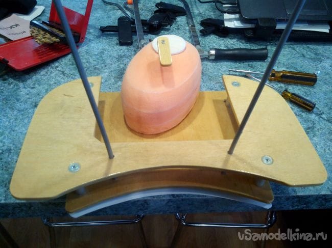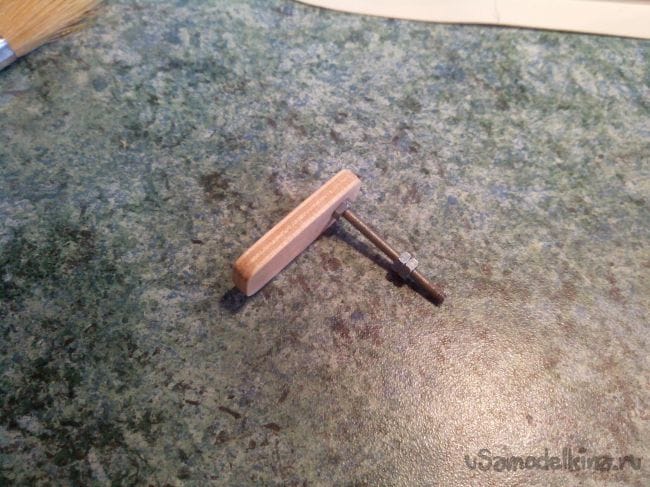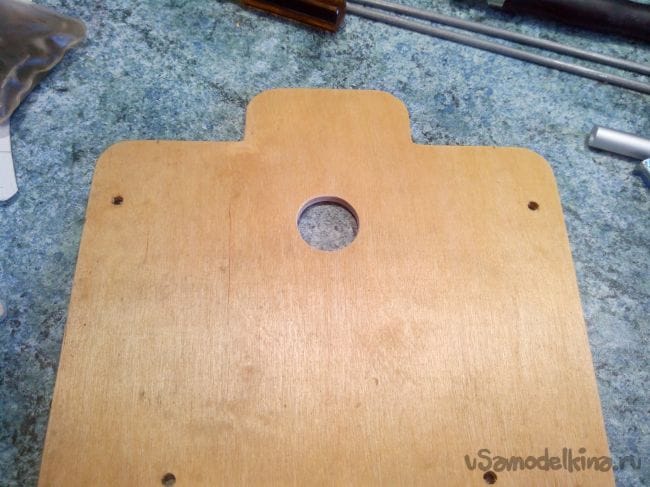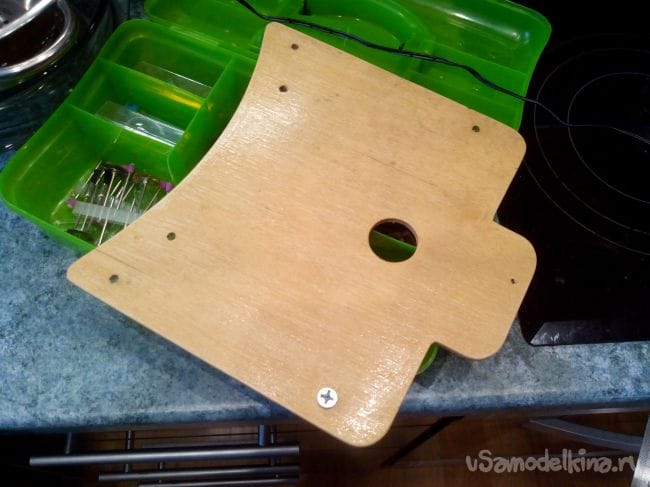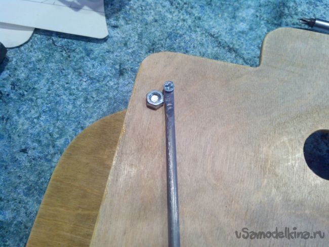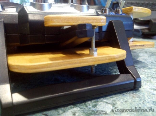 Для дополнительной фиксации аппаратуры на столике решено было сделать простенький фиксатор из кусочка фанеры и тонкого болтика. В целом, аппаратура весьма неплохо держится за счет силы трения, но я очень часто таскаю ее по полю на плече, а потому решил закрепить понадежней.