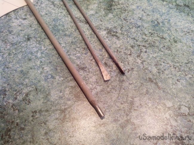 Берем два электрода для сварки, обколачиваем с них молотком на наковальне порошкообразное покрытие и расплющиваем один конец. Если наковальни нет, можно выйти на улицу и использовать в качестве наковальни чугунную крышку люка канализации или бетонный поребрик.