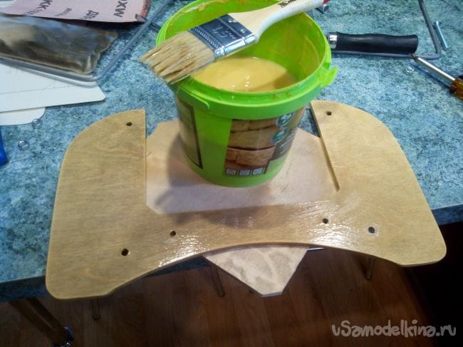 Покрываем лаком оставшиеся поверхности (верх и низ уже собранного столика и фиксатор).