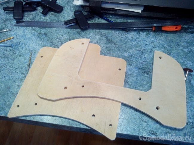 Прикладываем верхнюю и нижнюю часть друг к другу (можно зафиксировать прищепками) и сверлим отверстия сверлом 5 мм через обе детали.