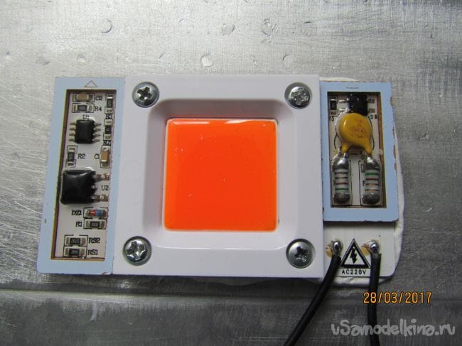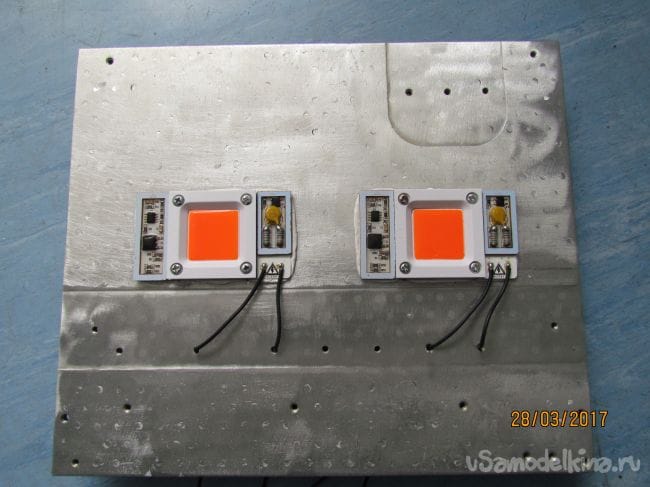 Привет всем. Светильник мощностью 100 ватт для выращивания томатов и огурцов теперь даже не разбирающийся в радиотехнике. Этот светильник собирается из игольчатого радиатора и двух светодиодных матриц по 50 ватт каждая. Так как эти матрицы имеют встроенный блок питания 220 В, они включаются просто в розетку. Матрицы я приобрел полного растительного спектра здесь.