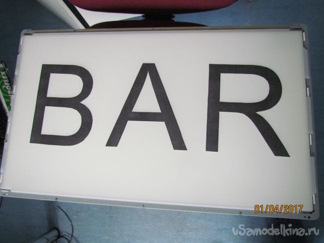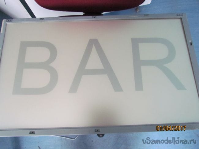 Подсветка работает. Теперь о тексте рекламы - он может быть любой. Я распечатал на принтере 3 буквы в формате А4. Буквы вырезал и уложил положил на толстую пленку и поочередно накладывая 3 других выбрал подходящий мне тон свечения .