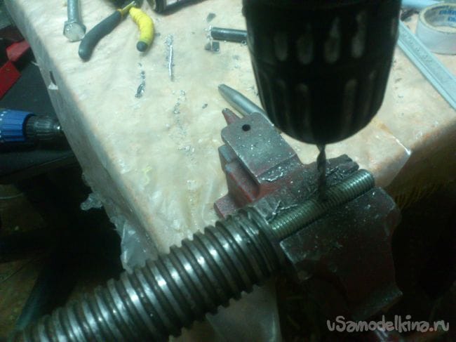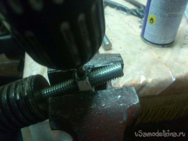 На шпильку я навернул гайку, и просверлил отверстие в гайке и в шпильке: