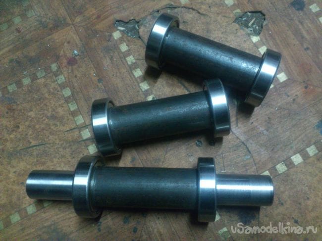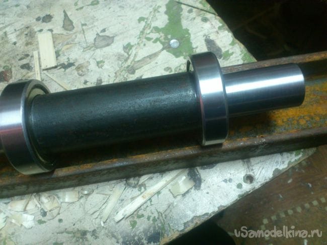 Начал я с изготовления основных рабочих элементов - валов. У меня был 40-ка мм кругляк, длинной полметра. Можно было взять потолще, но... этот у меня был! ))). А посему я распилил его на три части. Две - по 130 мм, и одну - всё, что осталось))))). На токарном станке проточил валы под подшипники (до 30-ти мм диаметра)