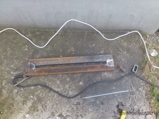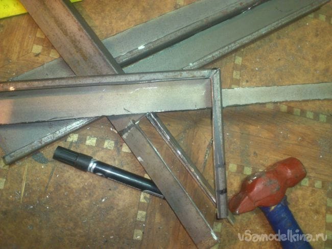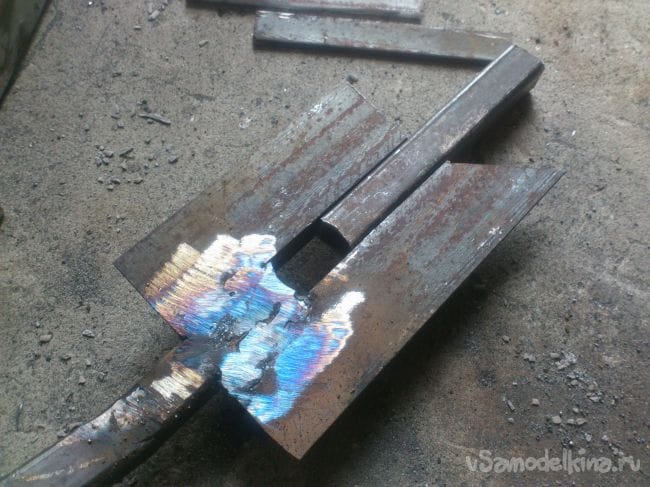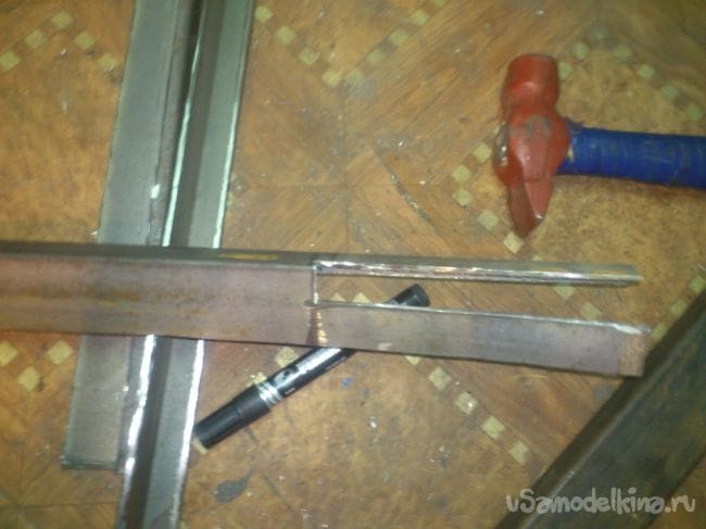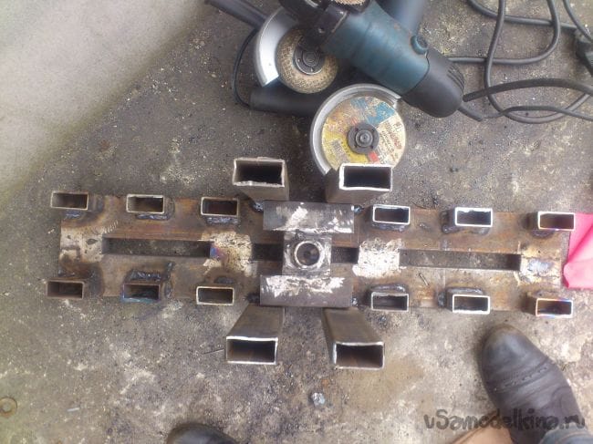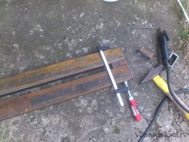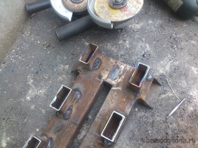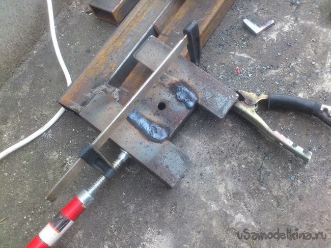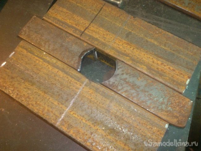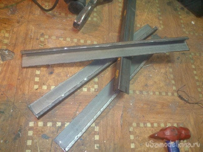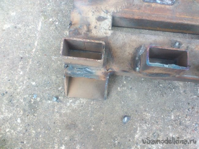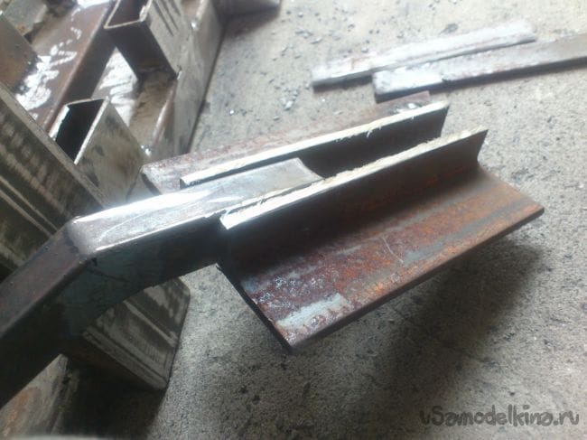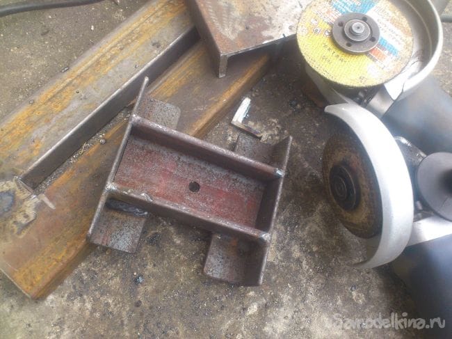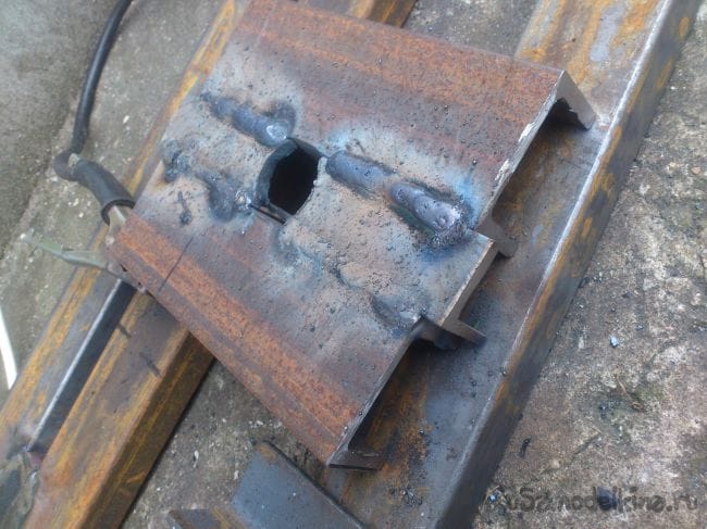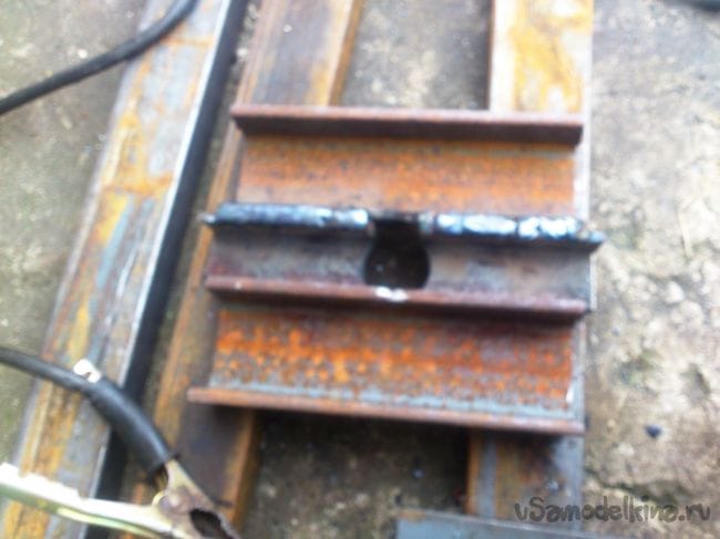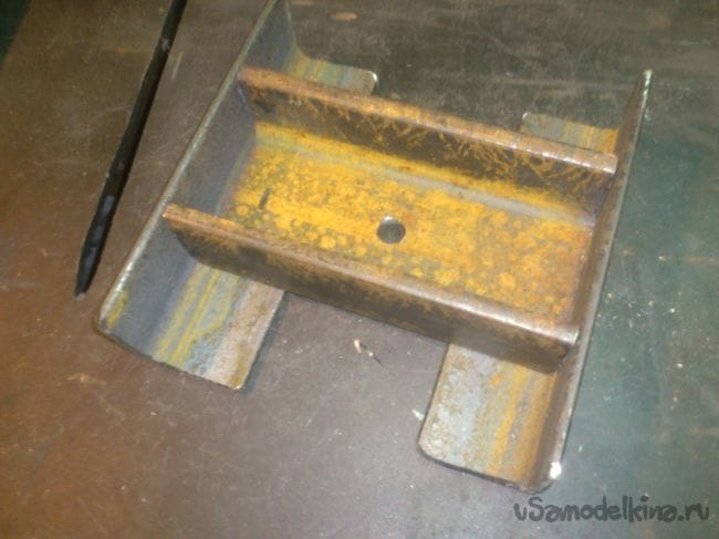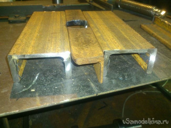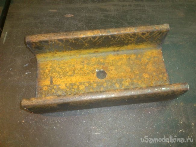 После того, как я вырезал швеллер нужной длины, я просверлил в его центре отверстие, а по бокам приварил поперёк по уголку: